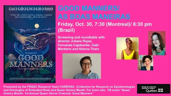 Friday, Oct. 30 7:30 pm in Montreal and 8:30 pm in Brazil, join us for the first annual Queer Horror Screening at McGill's Queer History Month: a screening and roundtable discussion on the queer Brazillian horror film "Good Manners" (As Boas Maneiras), with director Juliana Rojas, Fernanda Capibaribe, Gabi Monteiro and Alanna Thain. "Clara, a lonely nurse from the outskirts of São Paulo, is hired by mysterious and wealthy Ana as the nanny for her unborn child. The two women develop a strong bond, but a fateful night changes their plans." (imdb.com). A brilliant and contemporary take on vulnerability, danger and bodies under the influence of love, desire, violence...and the moon.