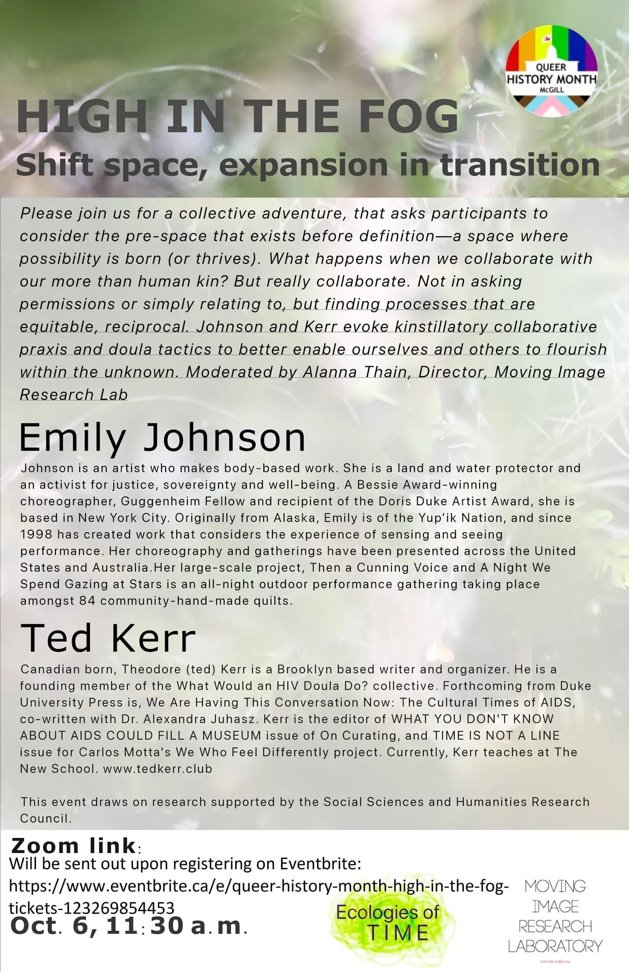 MIRL presents High in the Fog: a collective adventure that asks participants to consider the pre-space that exists before definition where possibility is born (or thrives). What happens when we collaborate with our more than human kin? But really collaborate. Not in asking permissions or simply relating to, but finding processes that are equitable, reciprocal. Emily Johnson and Ted Kerr evoke kinstillatory collaborative praxis and doula tactics to better enable ourselves and others to flourish within the unknown. Johnson is an artist who makes body-based work. Kerr is a Brooklyn-based writer and organizer. The discussion is moderated by the MIRL's Alanna Thain.