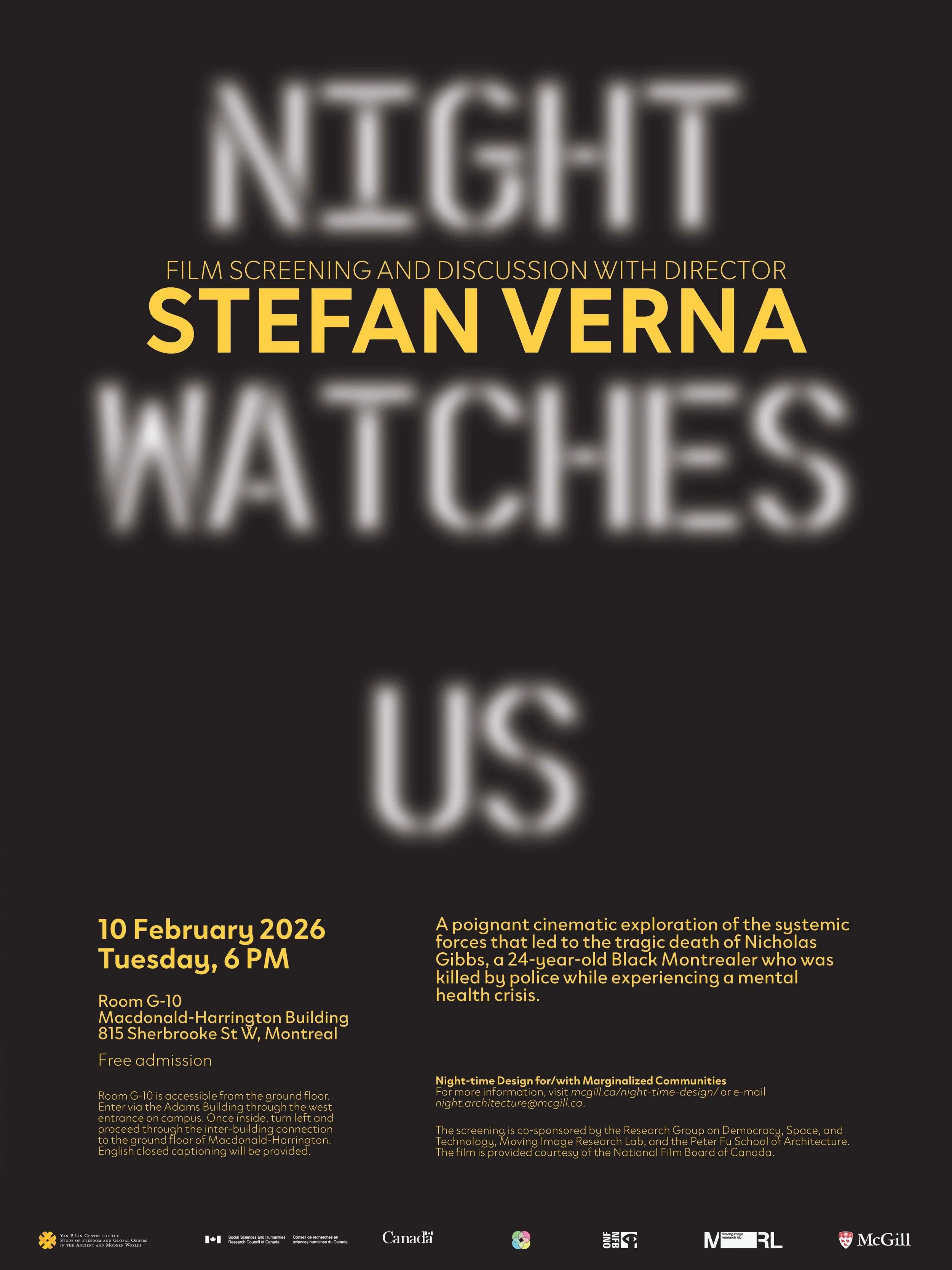 Join us for a screening of Stefan Verna’s documentary Night Watches Us, followed by a discussion with the director. The film offers a poignant cinematic exploration of the tragic death of Nicholas Gibbs, a 24‑year‑old Black Montrealer who was killed by police while experiencing a mental health crisis and psychosis.