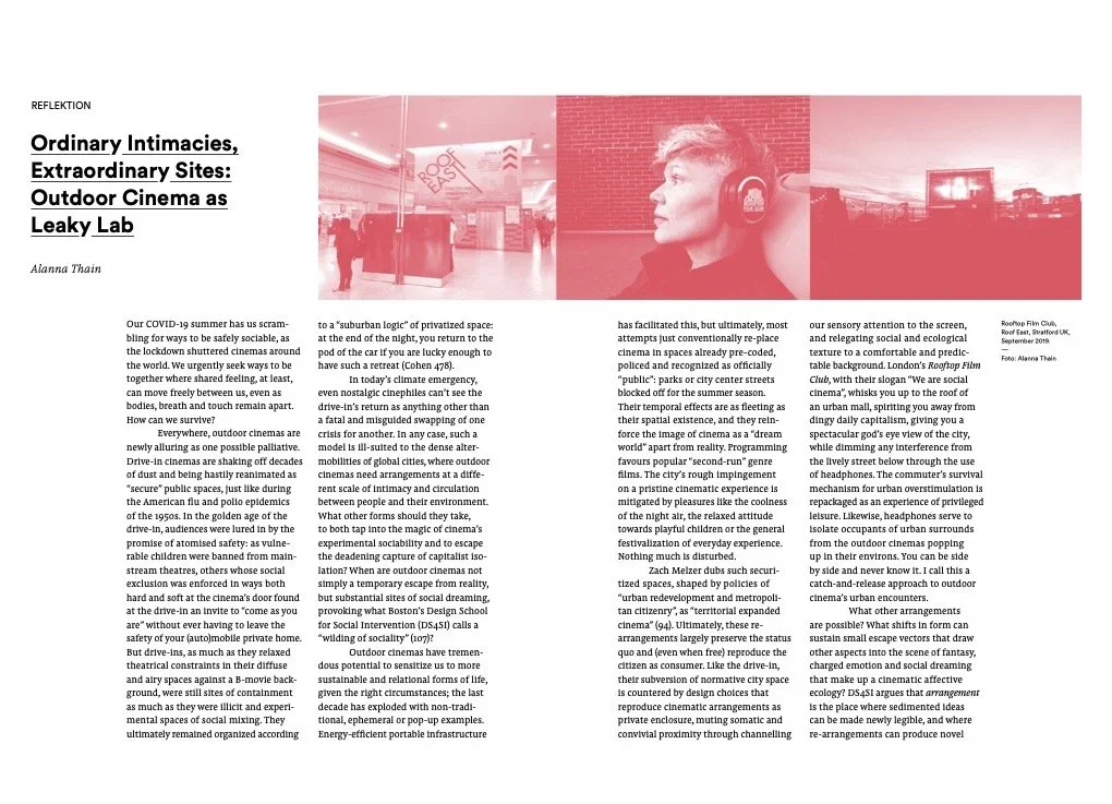 Alanna Thain “Reflektion: Ordinary Intimacies, Extraordinary Sites: Outdoor Cinema as Leaky Lab” https://smartkreativstad.com/wp-content/uploads/2020/10/Levande_bilder_levande_stad_screen_low.pdf